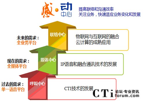 這是“感•動中心”的主旨,完全以客戶的業(yè)務為出發(fā)點,體現“以客戶為中心”的理念。而“全景中心”、“聯絡中心”等以純技術為中心,還停留在多媒體通訊和UC通訊手段融合層面,只是新增加了一些新方式的接入等技術,對于客戶業(yè)務的融合和適應,并沒有任何提升。
