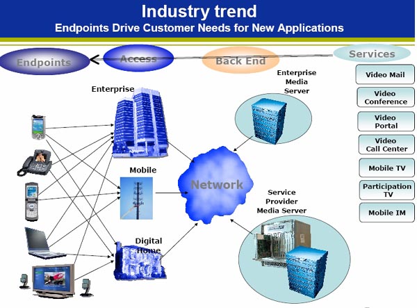 2.0 GHz處理器,因而具有比較強(qiáng)大的多任務(wù)處理性能。此外,該平臺(tái)還采用了一個(gè)高級(jí)子卡(AdvancedMC),用于消除回音并分擔(dān)代碼轉(zhuǎn)換的任務(wù)量。林競(jìng)宇指出:“我們的HMP是可以提供視頻服務(wù)的,把它放到通用平臺(tái)上就可以提供電信級(jí)或企業(yè)級(jí)應(yīng)用。而且,3G時(shí)代到來以后,視頻服務(wù)的種類會(huì)增多,用基于軟件技術(shù)的媒體處理可以快速響應(yīng)市場(chǎng)需求!