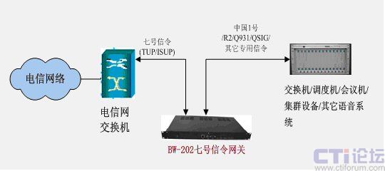 BW-202七號信令網(wǎng)關(guān)可實現(xiàn)多種信令方式與七號信令之間的互通。在當(dāng)前的電信網(wǎng)絡(luò)中,七號信令(SS7)系統(tǒng)已經(jīng)廣泛應(yīng)用,但很多傳統(tǒng)設(shè)備都還不具有七號信令接口,有些設(shè)備即使具有但也不標(biāo)準(zhǔn),BW-202七號信令網(wǎng)關(guān)能以最經(jīng)濟(jì)的方式幫助這些設(shè)備以標(biāo)準(zhǔn)的信令方式與七號信令設(shè)備連接, 其典型用法如圖所示: