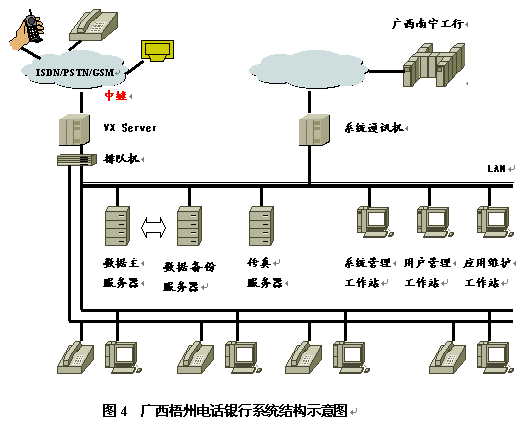 廣西工行推出的第一套銀行呼叫中心系統(tǒng)是在潤聲VX綜合信息系統(tǒng)開發(fā)平臺(UNIX版)上,在較短時間內(nèi)開發(fā)成功,首先在梧州分行開通運行,獲得用戶的一致好評,并希望與潤聲公司進一步合作。該系統(tǒng)的結(jié)構(gòu)如圖4所示。