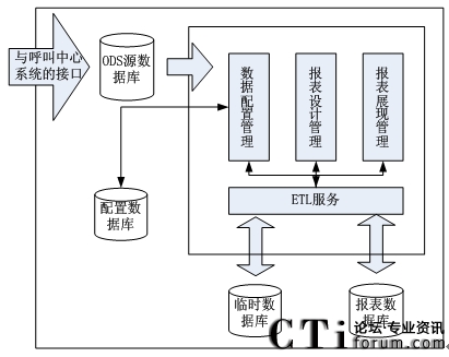 以上架構(gòu)圖中的呼叫中心是指呼叫中心系統(tǒng)的基礎(chǔ)話務(wù)功能部件,它是整個(gè)報(bào)表系統(tǒng)的基礎(chǔ),為其提供最初的數(shù)據(jù)來源,包括其基礎(chǔ)部件的通訊等。