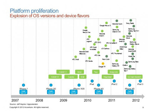 蘋果的iPhone開啟了智能手機(jī)的革命,并且很快獲得了消費(fèi)者的青睞,但是Android平臺(tái)正以一個(gè)更快的速度蔓延世界。在上個(gè)月的世界移動(dòng)大會(huì)上,Accenture的分析師 Lars Kamp分享了一份非常有參考價(jià)值的研究報(bào)告,揭示了移動(dòng)世界的未來(lái)趨勢(shì)。我們從中摘取了9幅數(shù)據(jù)圖供您參考: