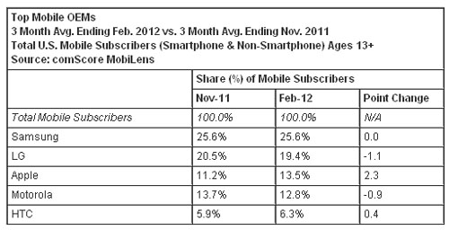 按截至今年2月份的三個(gè)月的平均數(shù)計(jì)算,美國(guó)13歲以上的手機(jī)用戶數(shù)為2.34億。三星名列手機(jī)原始設(shè)備制造商之首,占有美國(guó)手機(jī)市場(chǎng)25.6%的份額;LG電子名列第二,占有19.4%的市場(chǎng)份額;蘋果排名第三,占有13.5%的市場(chǎng)份額(上升2.3個(gè)百分點(diǎn));摩托羅拉排名第四,占有12.8的市場(chǎng)份額;HTC排名上升至第五,占有6.3%的市場(chǎng)份額(上升0.4個(gè)百分點(diǎn))。