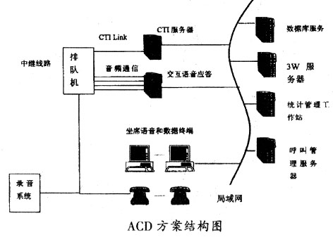 ____提供ACD方案的廠商傳統(tǒng)上是生產(chǎn)程控交換機(jī)的廠商。80年代以來,交換機(jī)廠家采取 了以下發(fā)展策略:在增強(qiáng)路由能力的基礎(chǔ)上開放交換機(jī)的控制接口,以標(biāo)準(zhǔn)的軟、硬件格 式提供CTI-Link,集成成熟的語音產(chǎn)品作為語音服務(wù)平臺(tái)。因此,ACD方案走的是一條基于 CTI-Link標(biāo)準(zhǔn)、專業(yè)通信和計(jì)算機(jī)廠家利用各自優(yōu)勢(shì)分工合作的路。