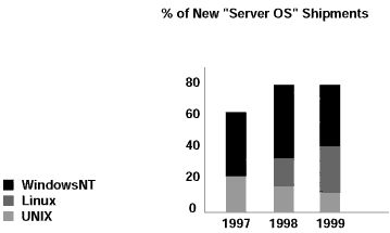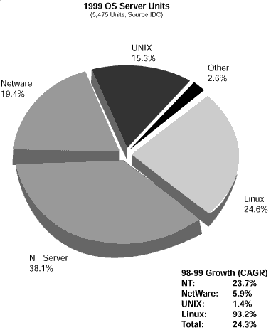 而且,在1999年Linux服務(wù)器增長率大約在98.3%,遠(yuǎn)遠(yuǎn)超過居于第二位的Windows的24%的增長率。